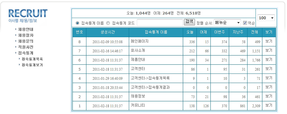 (9) 메뉴의 접속통계목록을 클릭하면 다음과 같이 접속통계목록 페이지가 나옵니다.