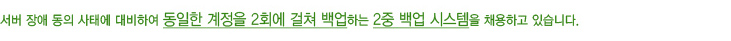 서버 장애 동의 사태에 대비하여 동일한 계정을 2회에 걸쳐 백업하는 2중 백업 시스템을 채용하고 있습니다. 그러나 고객은 자신이 운영   중인 서비스의 데이터 등에 대해 별도로 저장할 의무가 있으며 외부 침입 등으로 인한 정보의 유출, 누락 또는 자료의 손실에 대해 회사는   책임을 지지 않습니다. 단, 회사가 해당 자료를 백업하여 별도로 보관 중인 경우에는 복구 시 도움을 줄 수 있으며, 백업자료가 없는 경우에   는 회사는 책임을 지지 않습니다. 백업에 대한 자세한 안내는 [백업관리]를 참고하시기 바랍니다.