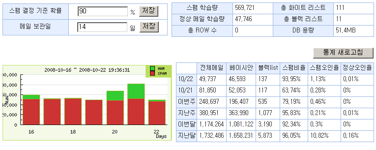 4. 스팸과 관련된 다양한 통계정보를 제공합니다. 스팸학습량, 스팸비율, 스팸메일오인식율(false-positive), 정상메일오인식율(false-negative), 필터DB크기, 필터서버정보 등 다양한 통계자료를 제공합니다.