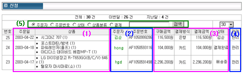 • (3) 은행입금일 경우 상태 부분에 입금자명이 표시되고, 카드결제일 경우 미결제 또는 결제완료로 표시되며 입금이 확인되어 배송중일 경우 배송중이라는 상태 표시가 나옵니다.